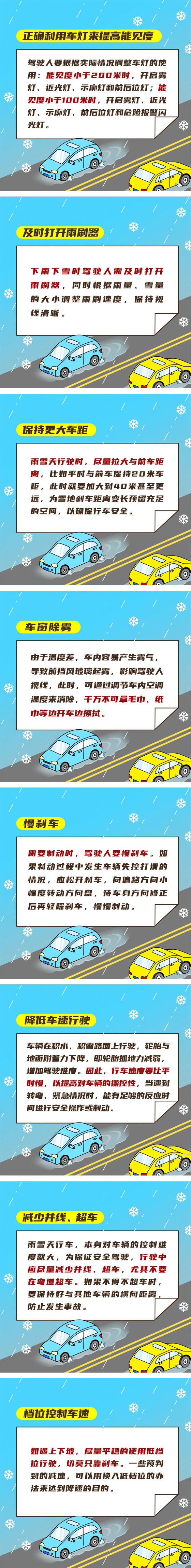 在此要提醒广大驾驶人:出行前一定要提前了解天气情况,合理规划行车线路。遇雨雪天气行车要牢记“降速、控距、亮尾”,打开雾灯、示廓灯、危险报警闪光灯,保持与横向、纵向车辆的安全距离。要尽量避免变道行驶、强超强会、急刹急转,以防发生危险。